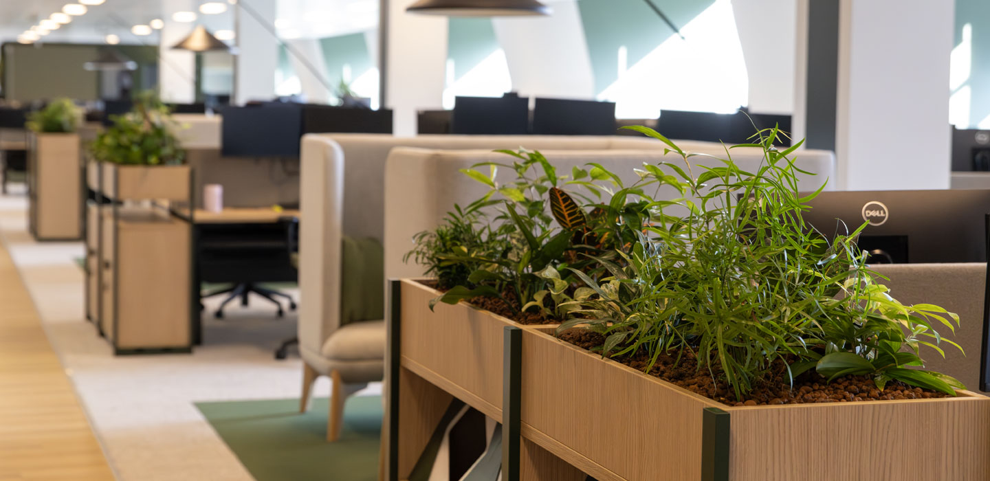 Planted cabinet troughs create a natural privacy barrier between desks. They reduce distractions, helping people feel more focused without taking up valuable desk space.